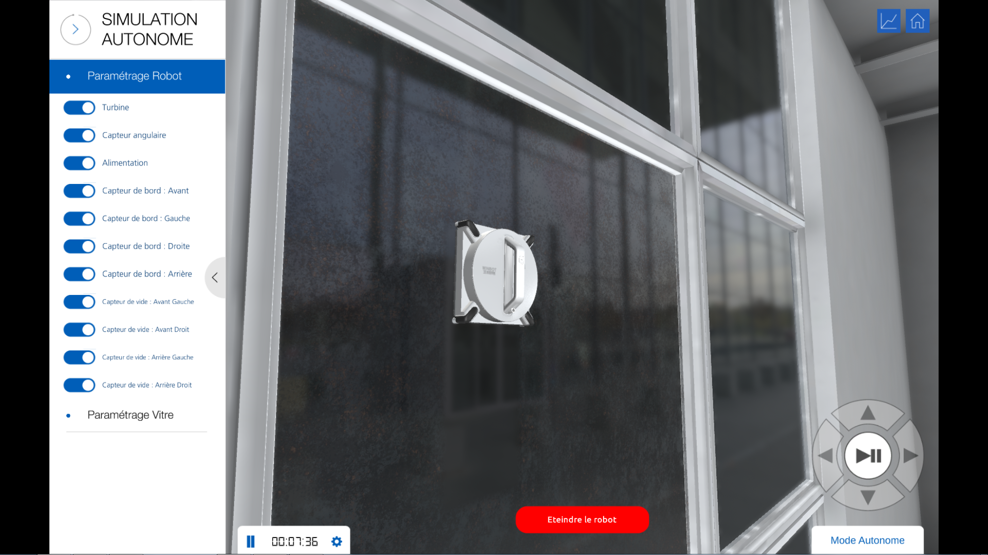 - simule l’environnement extérieur au robot tel que la gravité, la présence ou l’absence de rebord de la fenêtre ainsi que son inclinaison, l’état de saleté de la vitre ;